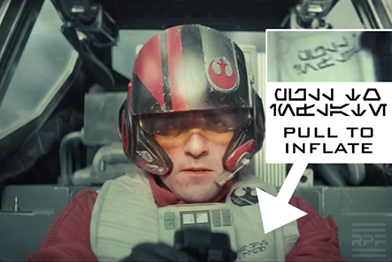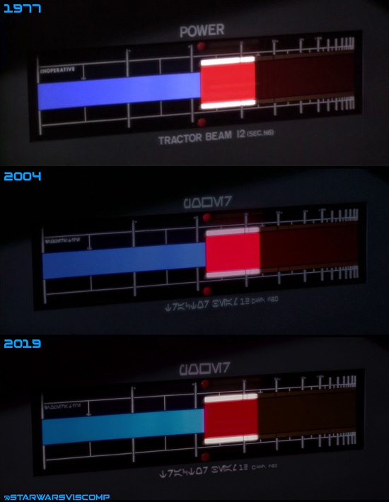 不是希伯來語,而是Aurebesh-由Galactic Basic組成的34個(gè)字母。直到《絕地歸來》才會出現(xiàn)(除非您算出ESB中Vader胸箱上的第一個(gè)涂鴉),并且在所有顯示器和標(biāo)簽上都顯示。通過特殊版本將其編輯為以前的電影,如下所示: