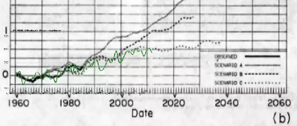 這是James Hansen在1988年向國會(huì)提交的圖表。這張圖表,以及漢森的表演和對(duì)聽證環(huán)境的操縱,足以讓國會(huì)相信全球變暖是一個(gè)嚴(yán)重的威脅和緊急行動(dòng)的原因。圖表顯示了3個(gè)情景。我們的排放。答:如果我們?cè)黾优欧帕?,B就是如果我們保持最新狀態(tài),那么如果我們?cè)?000年之前將全球排放量減少到零,那么綠線就是實(shí)際記錄的溫度。這說的是什么?在漢森所預(yù)測(cè)的附近,溫度并沒有上升。真正的問題是,自1988年以來,全球排放量已超過圖中概述的最壞情況。HTTP://www.washingtonpost.com/bu ...但還有更多:海平面: