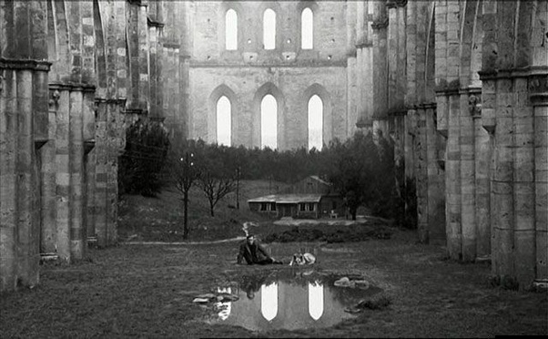 下面是Andrei Tarkovskyi的電影“懷舊”。塔科夫斯基在他的作品中探索了許多逃避現(xiàn)實的途徑,從愛情和偶像繪畫到為人類服務(wù)而折磨自己的房屋。對他來說,最終逃脫的希望是水的象征-最終,它戰(zhàn)勝了所有人,并使一切復位。