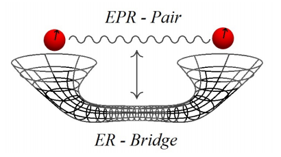 換句話說(shuō),如果你給我一個(gè)量子態(tài),我可以給你一個(gè)算法(雖然需要很多簡(jiǎn)化的假設(shè))可以從該狀態(tài)的糾纏屬性重建空間幾何。在該框架中,例如,一對(duì)粒子的纏結(jié)狀態(tài)導(dǎo)致“出射幾何形狀”,其包含兩個(gè)粒子之間的連接橋。所有這一切的妙語(yǔ)是空間(時(shí)間)可以從糾纏中浮現(xiàn)出來(lái)。