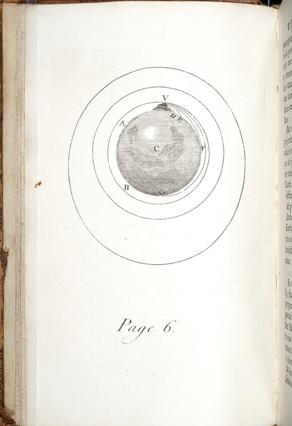 我認為這個數字來自艾薩克·牛頓的關于世界體系的論述,后來于1728年出版,特別美麗,特別是如果從概念上判斷它。它說明了一個思想實驗,現在被稱為“牛頓大炮”或“牛頓山”。沒有看過這個并被理解的理科學生會忘記它。